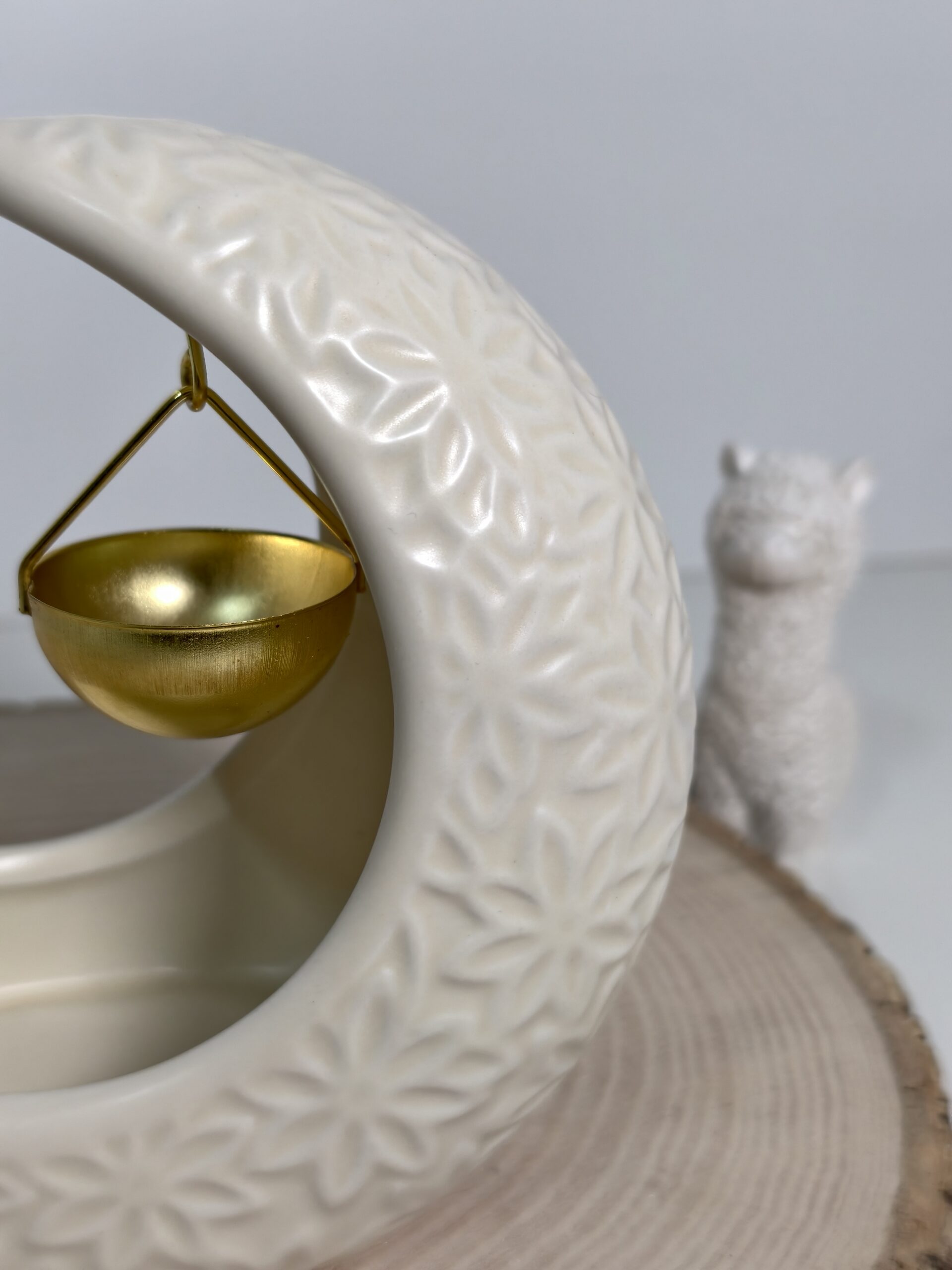 Luna Duna es un quemador con forma de luna en tono beige suave que transmite calma y armonía. Su color arena evoca paisajes cálidos y naturales, mientras su silueta lunar aporta un toque místico y delicado a cualquier espacio.