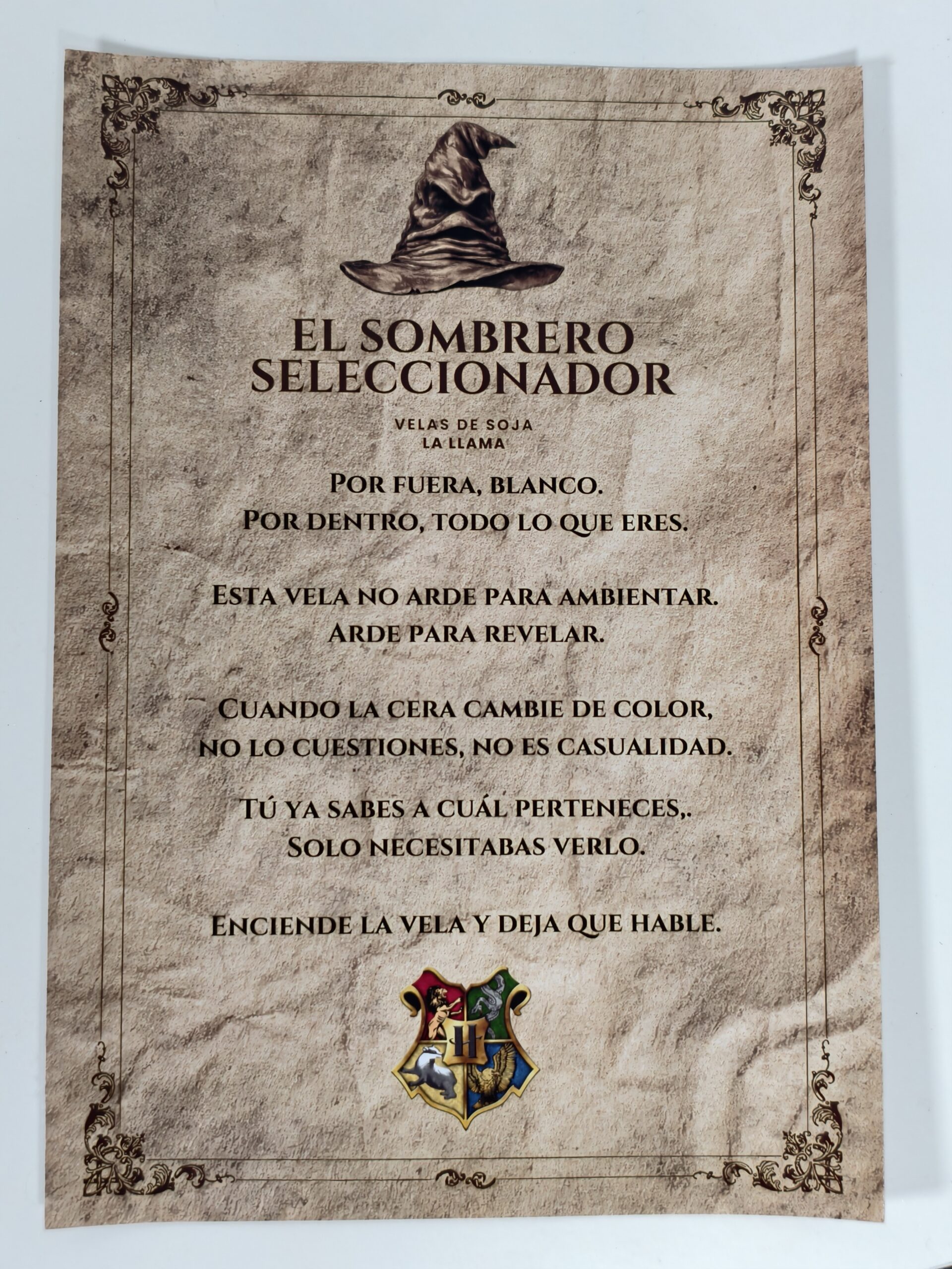 Deja que la magia decida tu destino. Al encender esta vela inspirada en el legendario Sombrero Seleccionador, descubrirás a qué casa perteneces: Gryffindor, Hufflepuff, Ravenclaw o Slytherin. Solo tendrás que esperar unos minutos.